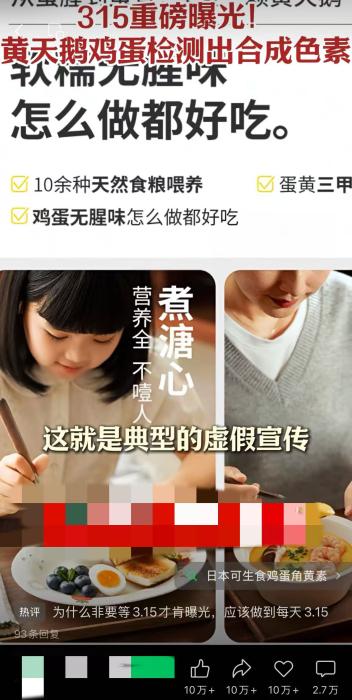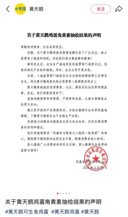 3月15日,有发布视频,黄天鹅鸡蛋检测出人工合成色素角黄素(斑蝥黄)。“斑蝥黄就是人工合成色素,国度答应做为饲料添加剂限量添加正在蛋鸡饲猜中,但你宣传不含人工合成色素,成果却检出了,这就是典型的虚假宣传。”值得留意的是,该报道中的检测成果援用自某打假团队,其正在3月15日前夜发布检测成果,称正在许昌胖东来采办的黄天鹅鸡蛋角黄素含量为0。399mg/kg。报道发布后激发普遍关心。3月16日,黄天鹅通过社交平台发长文做出回应。长文中,黄天鹅质疑将“检出角黄素”等同于“添加人工合成色素”,是对的严沉:多种专业文献显示0。1-0。5mg/kg(我司产物检出值仅0。399mg/kg),能够判断为天然含量,不属于人工添加。有称接到前述打假团队再次爆料,永辉超市所售黄天鹅鸡蛋经检测又检出角黄素,数值远超胖东来所售批次。该报道称,分歧批次鸡蛋中角黄素含量差别很大,假如黄天鹅像本人的仅用万寿菊、辣椒红等天然色素给蛋黄减色,不该呈现如斯成果,因而质疑原料或添加环节存正在较着问题。